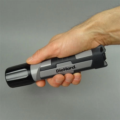 The DieHard 4AA flashlight has a nicely balanced beam with a bright center spot. With 2 brightness levels, this DieHard flashlight is a great flashlight for work, around the house, outdoor activities, etc. Choose high for distance – up to 570 foot beam range. Choose low for close up applications and for a long runtime of up to 70 hours.