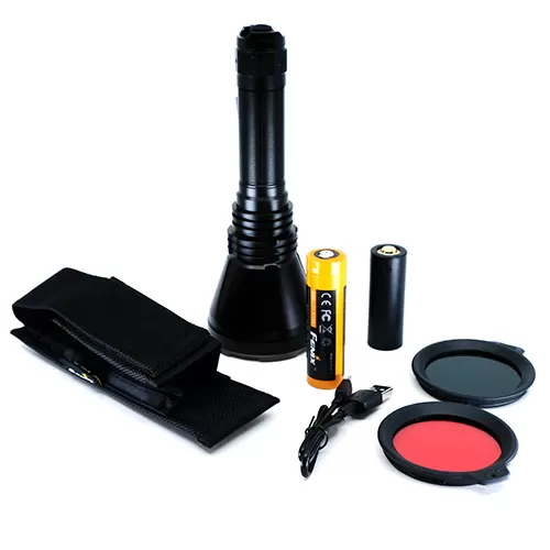 What’s included: Fenix HT18 flashlight, rechargeable battery, red and green filters, USB-C charging cable (plug adapters sold separately), 18650 battery holder (converts 18650 to 21700 battery), nylon belt holster, wrist lanyard, spare O-ring, spare switch cover