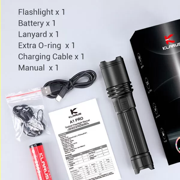 What’s included: Klarus A1 Pro, rechargeable battery, USB-C cable, wrist lanyard, spare O-ring