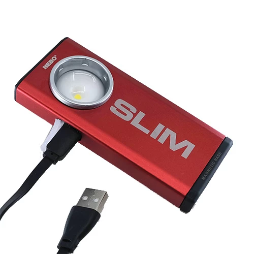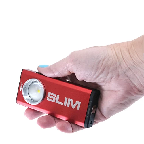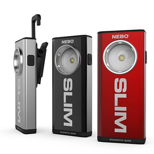 What’s included: NEBO Slim with internal rechargeable battery, integrated clip and hanging hook and USB cord (plug adapters not included)