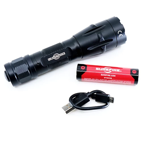 What’s included: SureFire Fury-DFT flashlight with choice of battery options (model that includes 18650 battery also includes USB cable – charging plug adapter available separately)